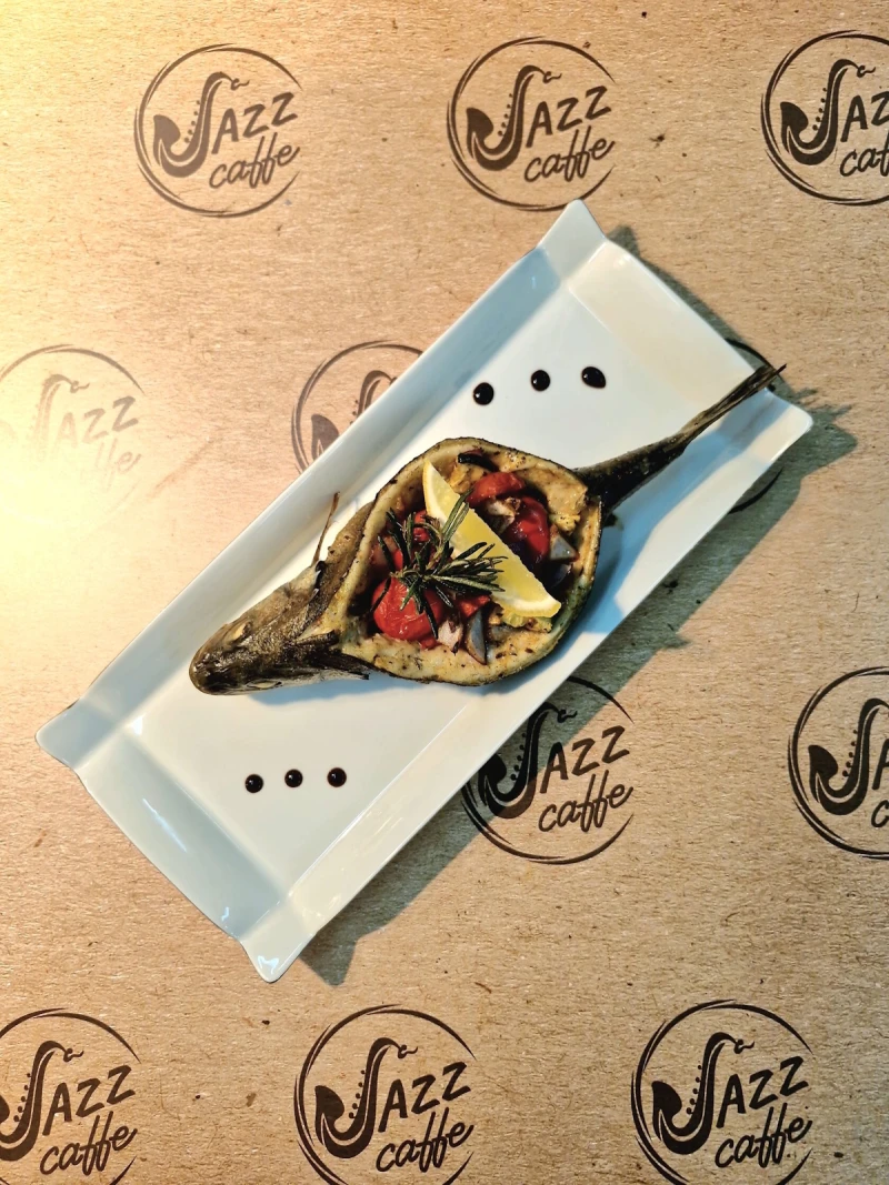 Нежный сибас с золотистой корочкой, запеченый с цуккини, черри и сладким перцем. Подается с лимоном и розмарином - простота и совершенство средиземноморской кухни в каждой детали.